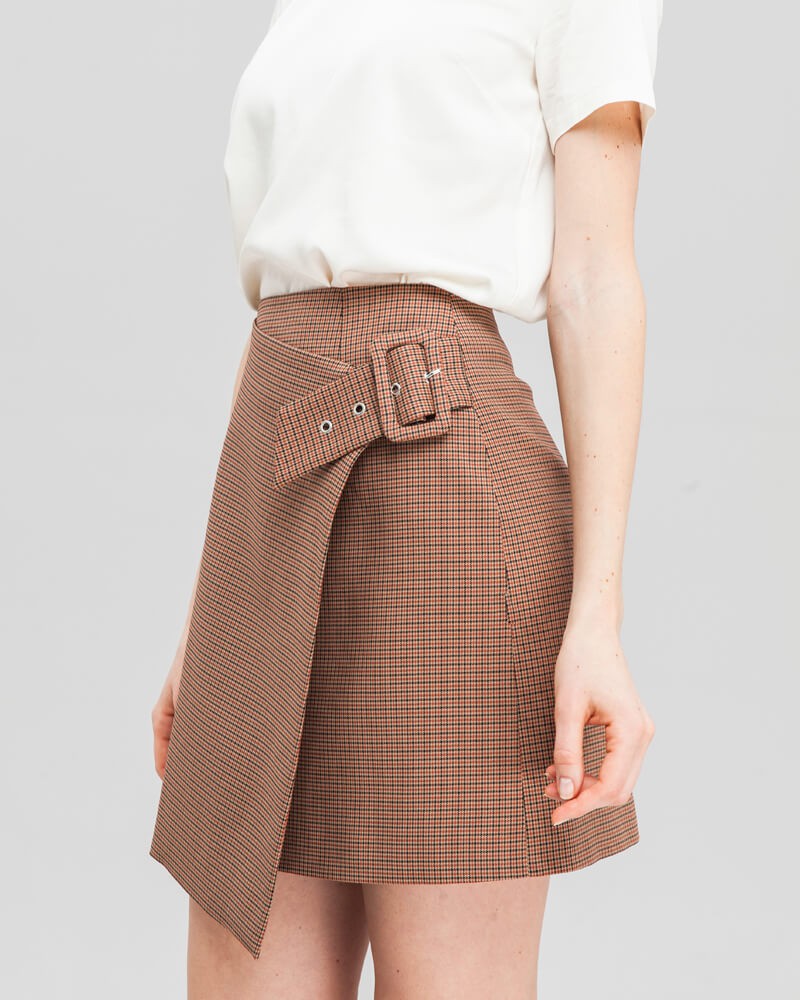 Юбка на запах длины мини из плотной костюмной вискозы дополнена хлястиком с обтяжной пряжкой в тон изделия. Идеальная вещь, чтобы разнообразить офисные образы. Сочетайте с однотонными пиджаками, блузами и трикотажем.