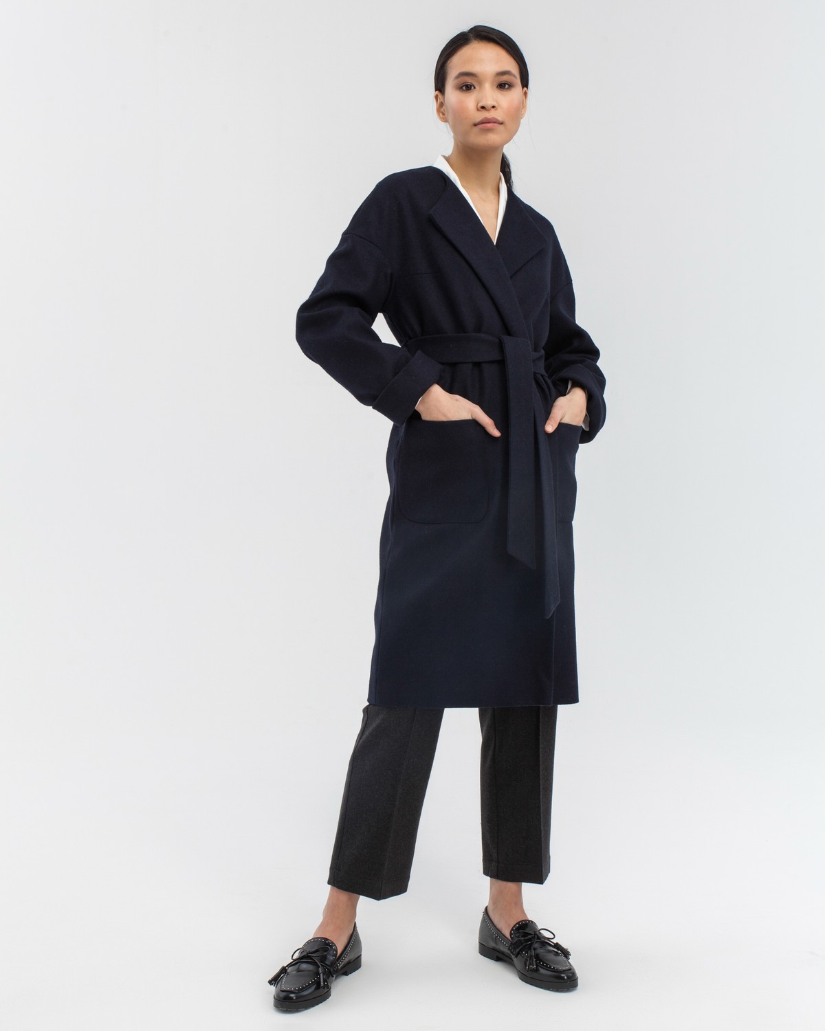 Пальто из плотной шерстяной ткани на подкладке. Свободного кроя с широкими рукавами и необычным обрезным воротником.