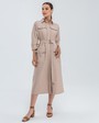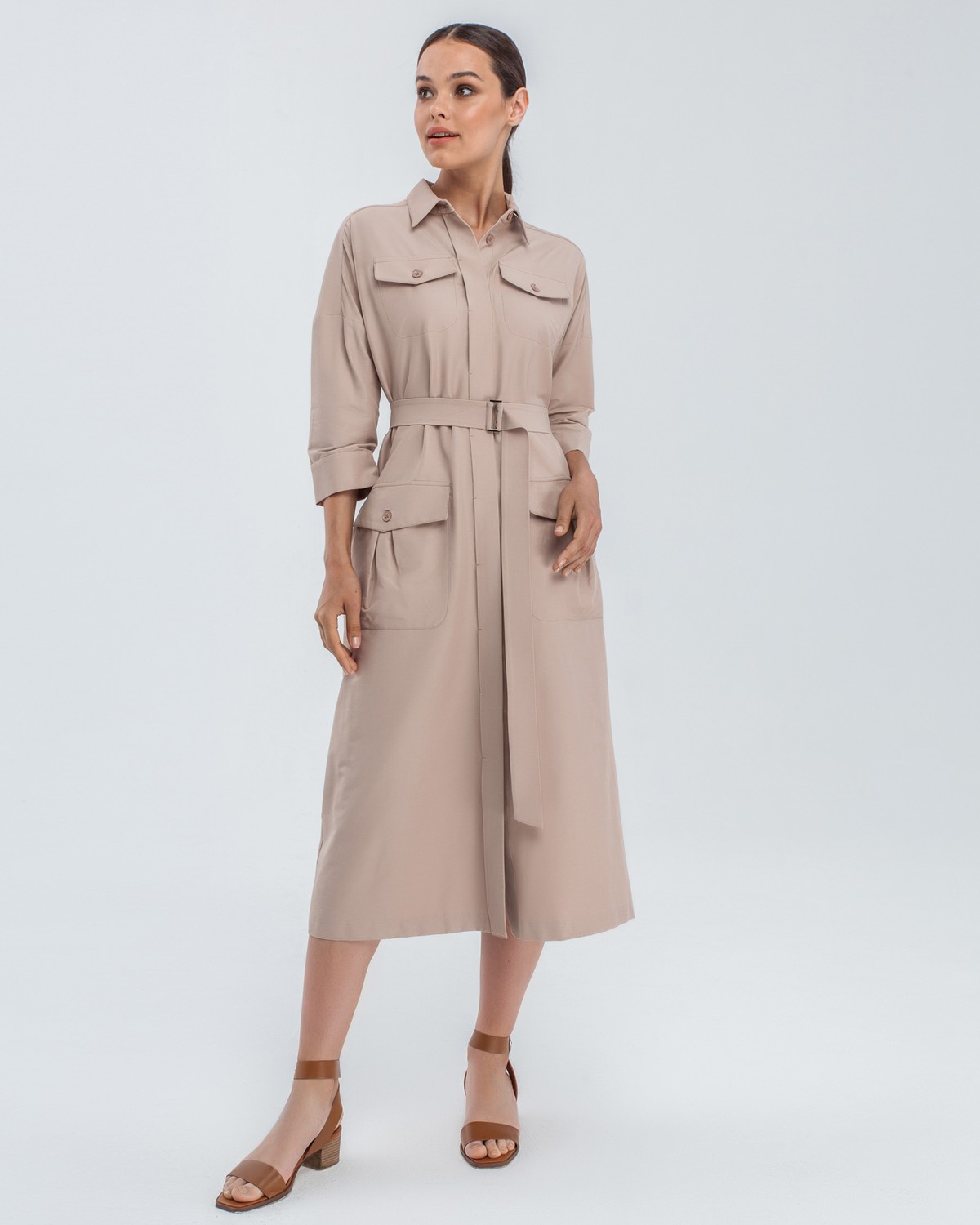 Платье-рубашка с рукавом 3/4 в стиле Сафари. Дополнено накладными карманами на груди и на бёдрах и поясом в тон изделия с металлической пряжкой. Платье можно носить как самостоятельно, так и как второй слой поверх любого комплекта.