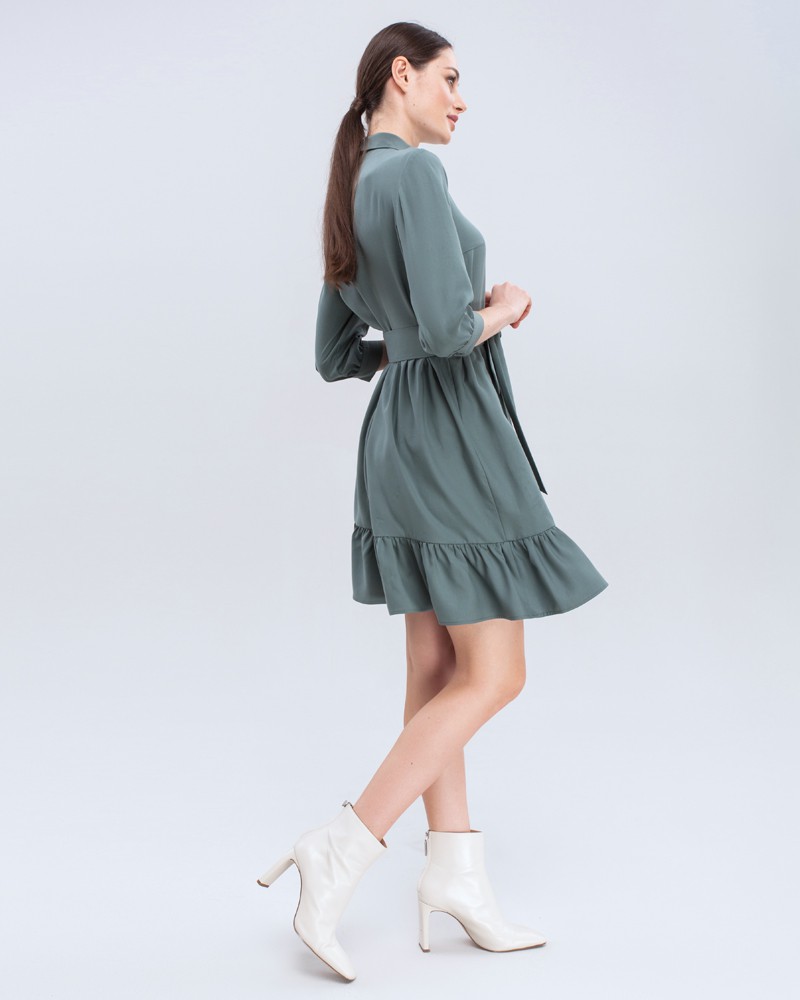 Платье-рубашка длины чуть выше колена и рукавом три четверти. Дополнено воланом на подоле и широким поясом в тон изделия. Женственный силуэт платья позволит создать игривый, весенний лук.