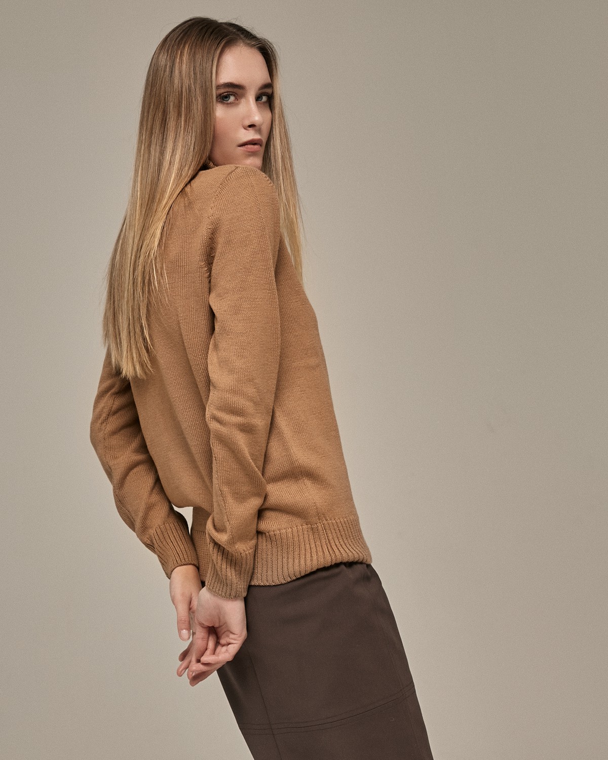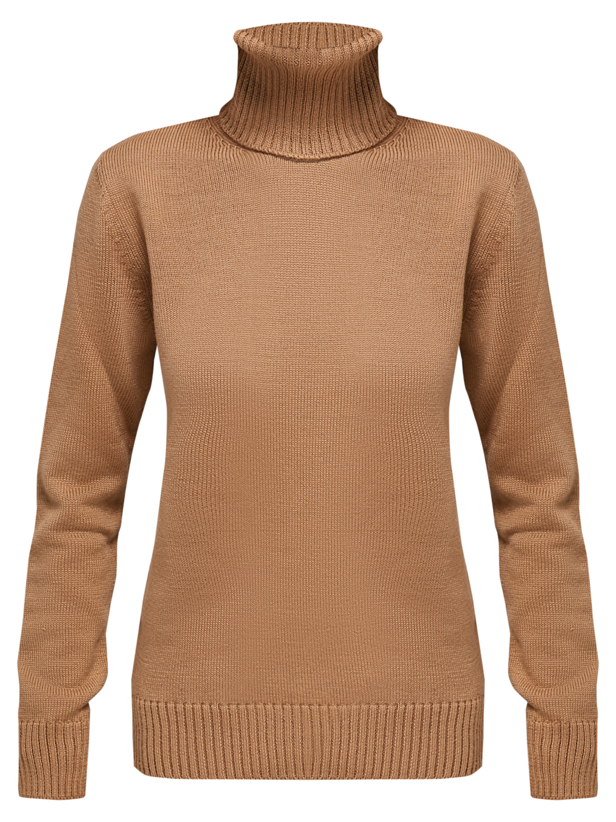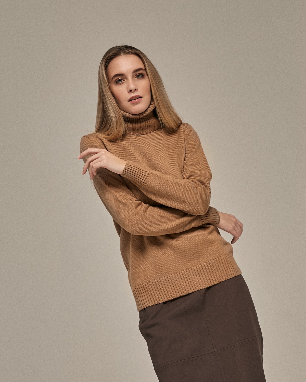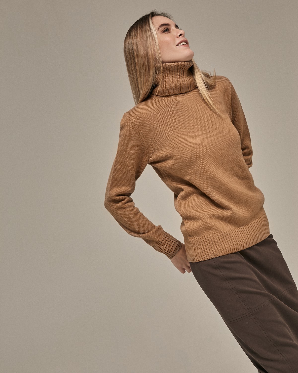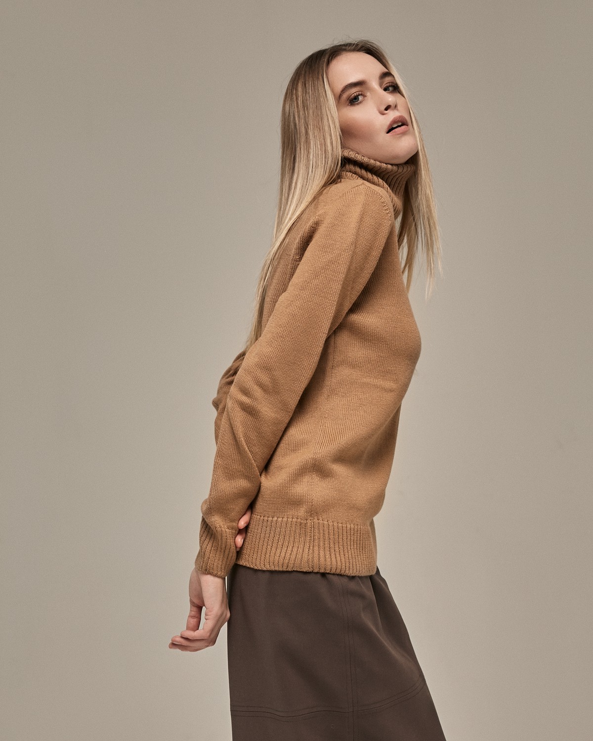 This basic wool turtleneck features a high collar and long sleeves. A universally flattering piece for any body type.