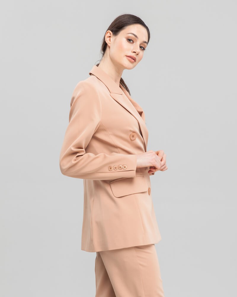 Слегка приталенный двубортный жакет послужит удачным дополнением не только к деловым нарядам, но и к повседневным образам. Незаменимый элемент базового гардероба, который легко сочетать с брюками, юбками, платьями и денимом.