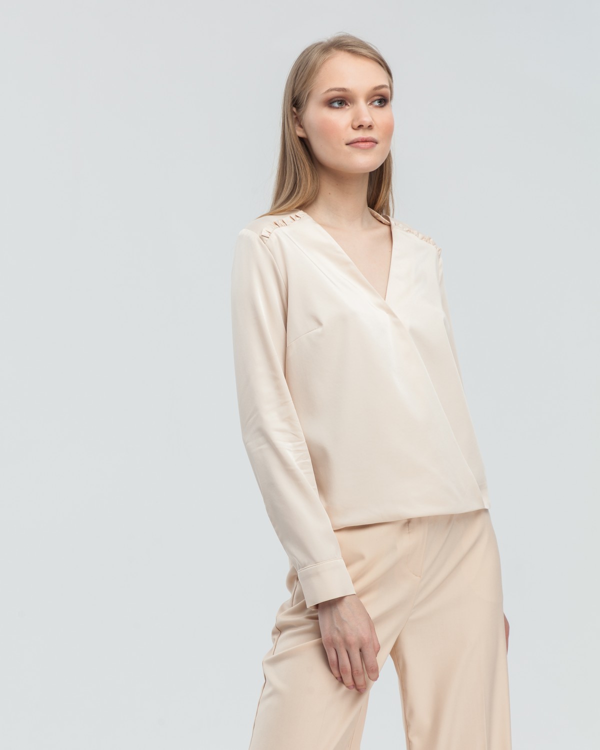 Базовая блуза с длинным рукавом и запАхом дополнена маленькой рюшей на груди. Сочетайте с брюками, юбками, джинсами для создания деловых и повседневных образов.