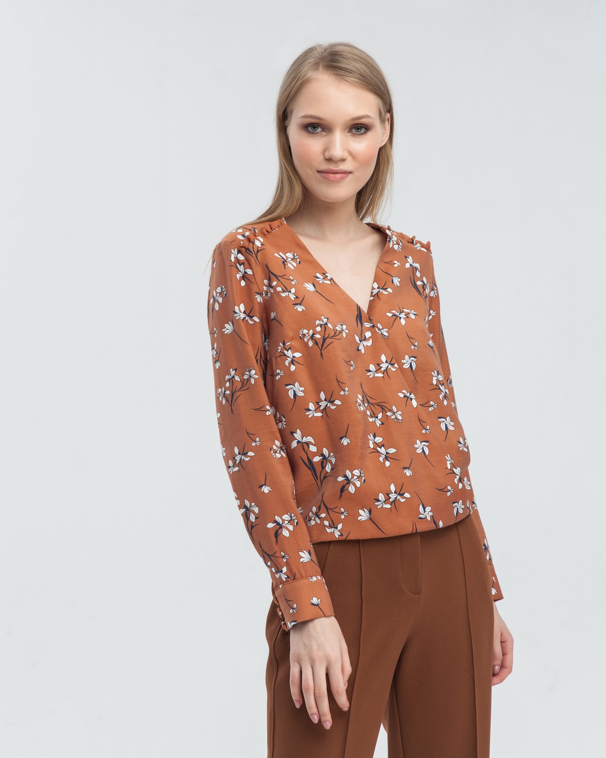 Базовая блуза с длинным рукавом и запАхом дополнена маленькой рюшей на груди. Сочетайте с брюками, юбками, джинсами для создания деловых и повседневных образов.