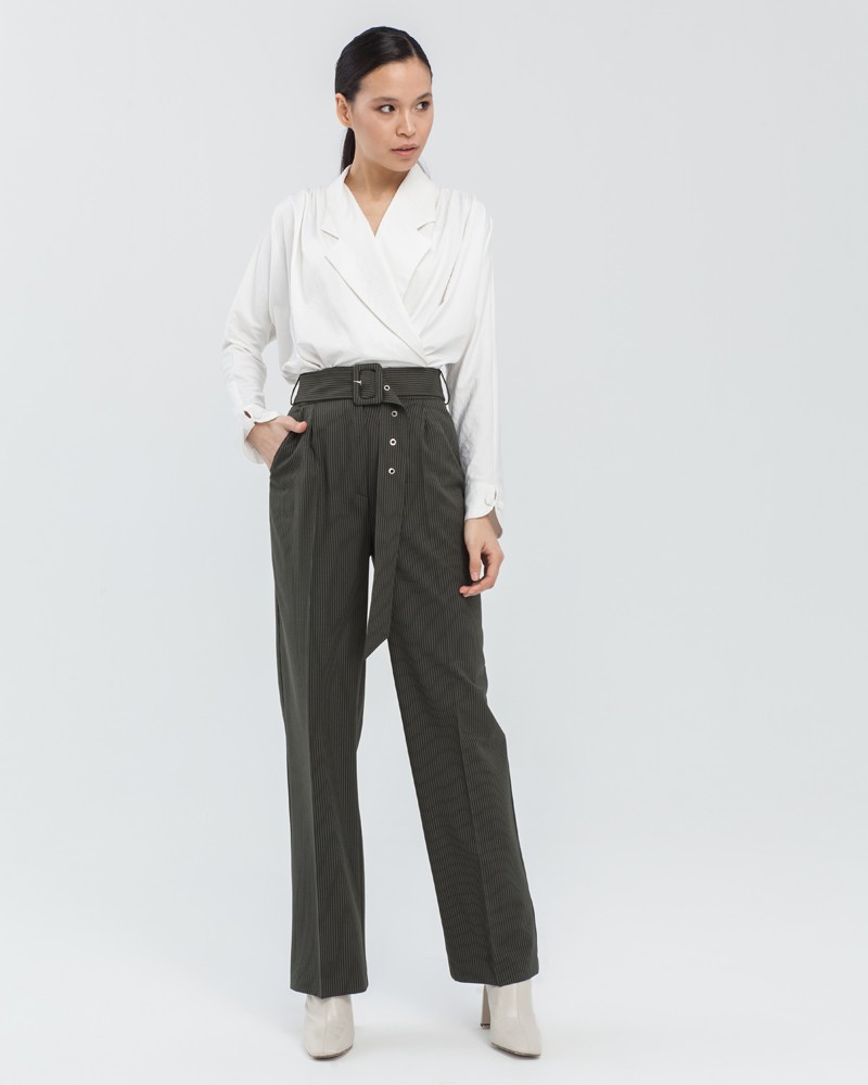 Широкие прямые брюки с посадкой на талии. Дополнены длинным поясом в тон изделия с обтяжной пряжкой. Свободный крой и структурированный силуэт позволяет создавать не только деловые, но и расслабленные повседневные образы.