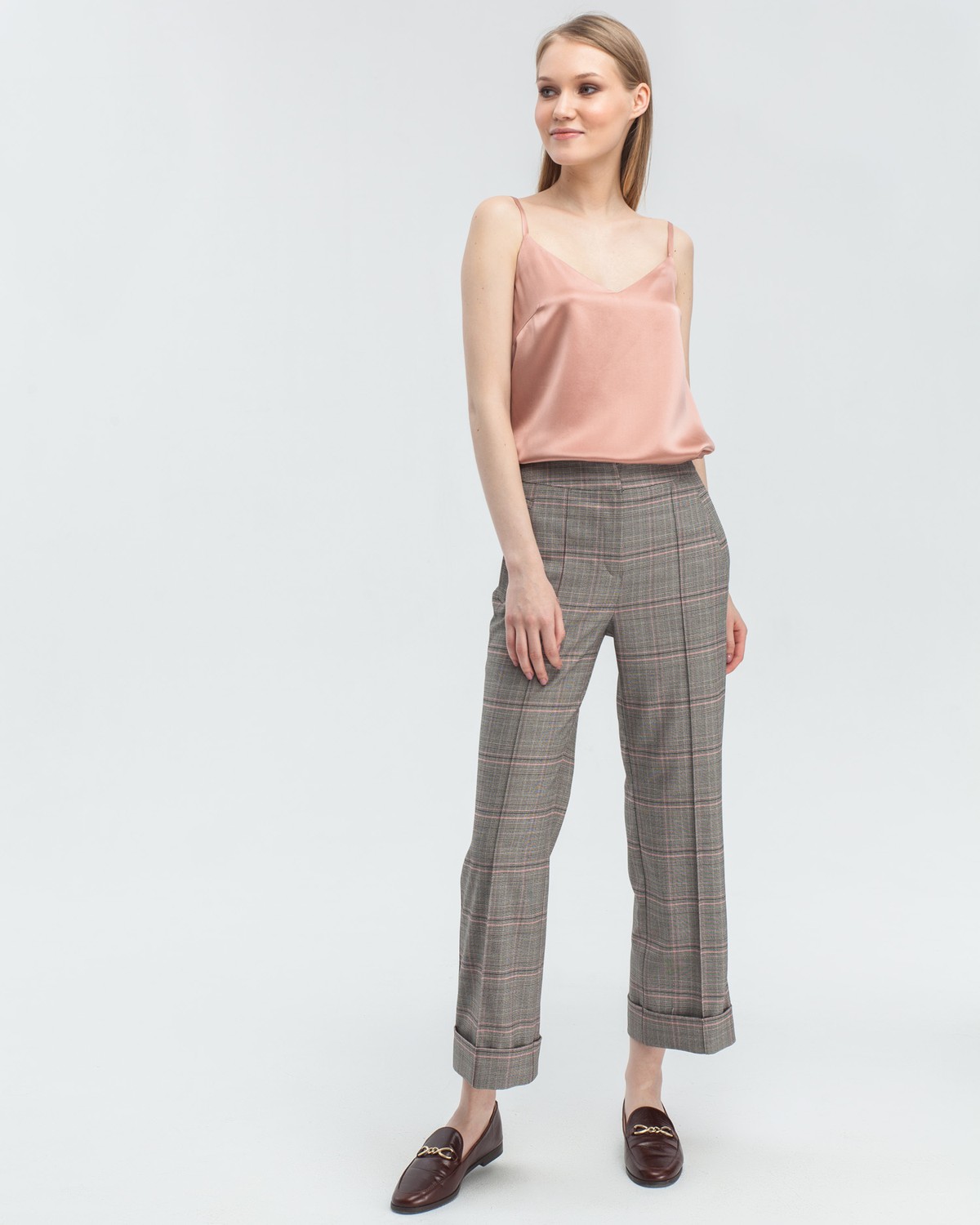 Прямые , укороченные брюки с простроченной стрелкой и отворотами. Укороченная длина оголяет щиколодку, что добавляет образу легкости и позволяет сочетать эти брюки, как с низким ходом, так и с каблуками.