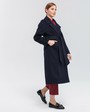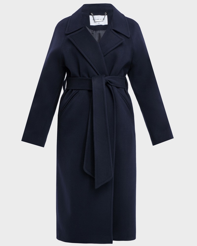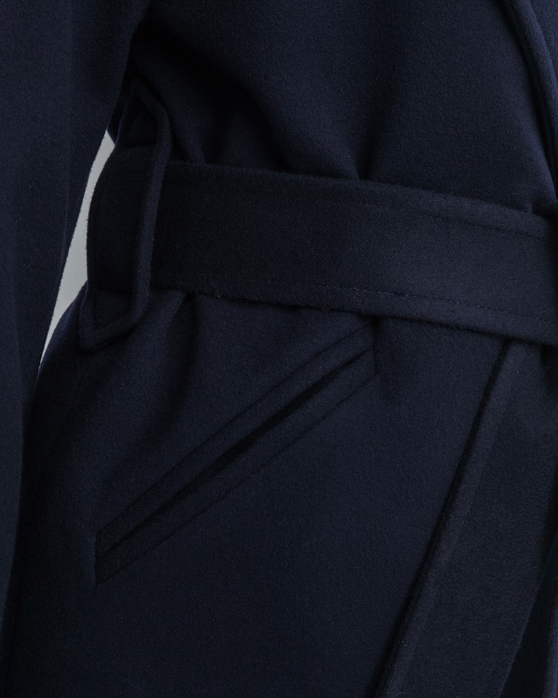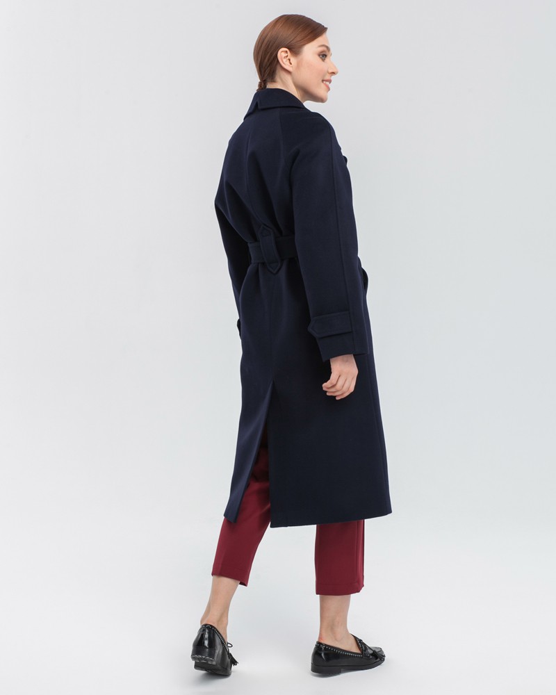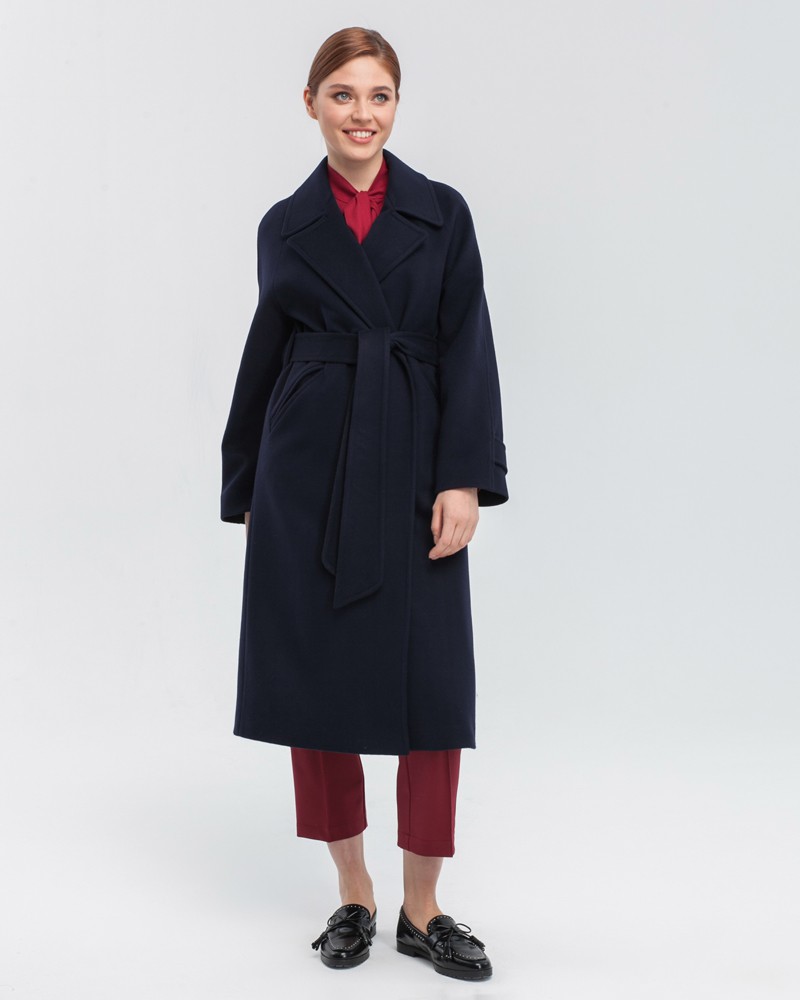 Пальто-халат с клапанами на карманах, рукавом реглан. Дополнено декоративными отстрочками и воротником-стойка с фигурным вырезом. Данная модель красиво подчеркивает женственные формы за счет пояса.