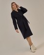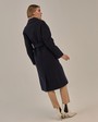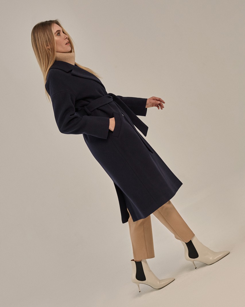 Пальто-халат из плотной шерсти. Модель прямого силуэта с английским воротником. Пальто дополнено двумя вместительными карманами, без застежки, с поясом из основного материала.