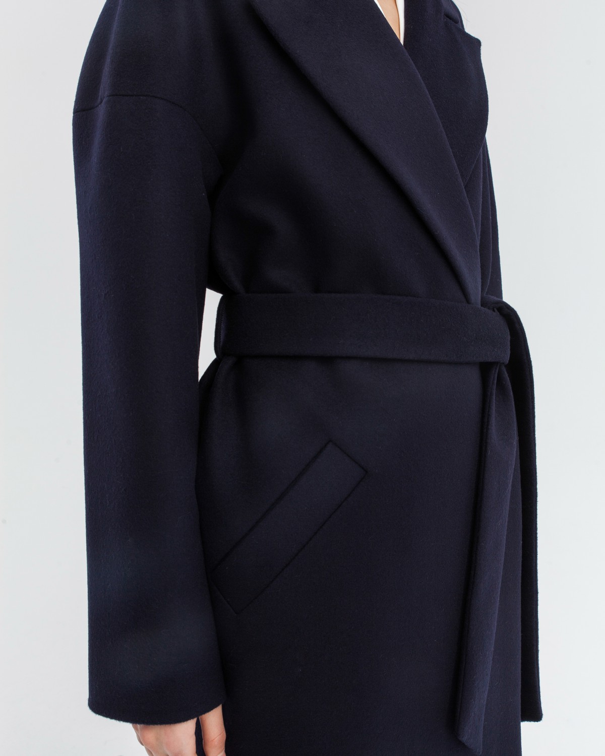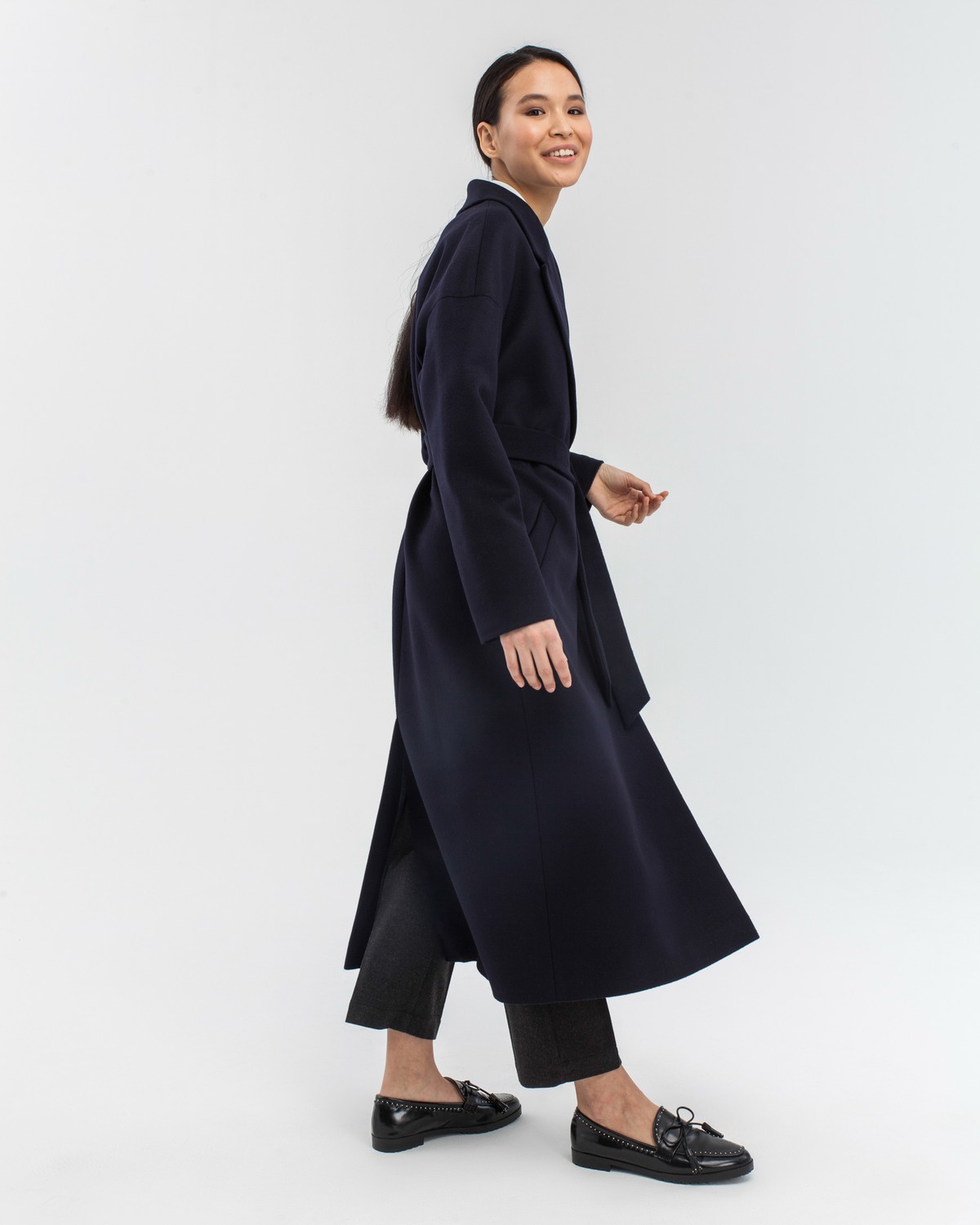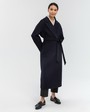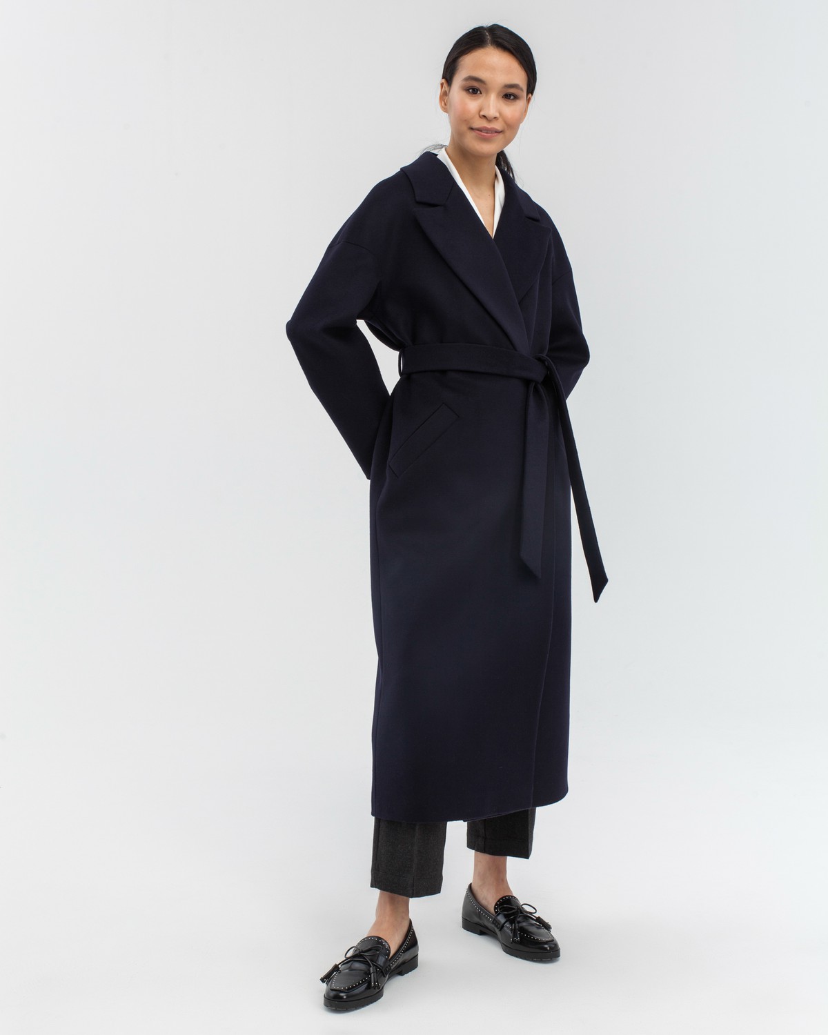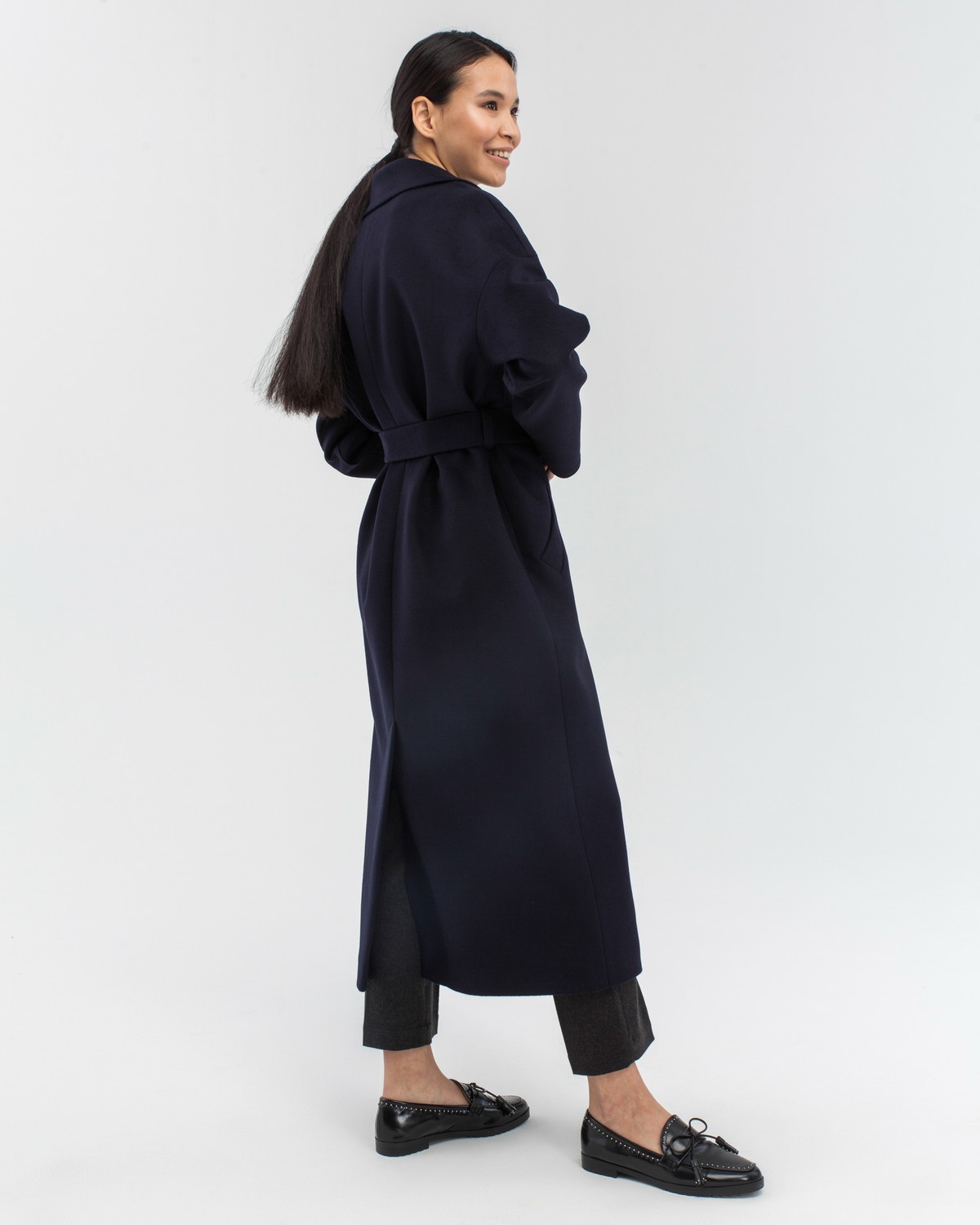 Пальто-халат длины maxi из плотной шерсти с кашемиром. Модель прямого силуэта с английским воротником. Пальто дополнено двумя вместительными карманами, без застежки с поясом из основного материала.