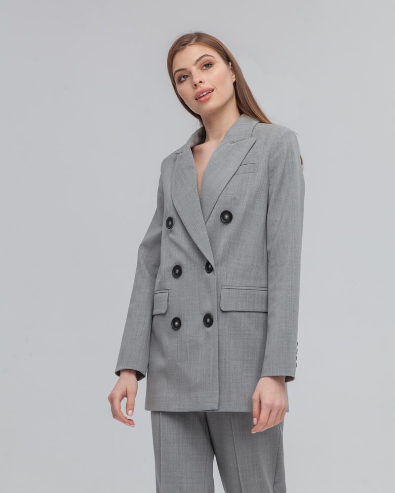 Прямой двубортный жакет послужит удачным дополнением не только к деловым нарядам, но и к повседневным образам. Незаменимый элемент базового гардероба, который легко сочетать с брюками, юбками, платьями и денимом.